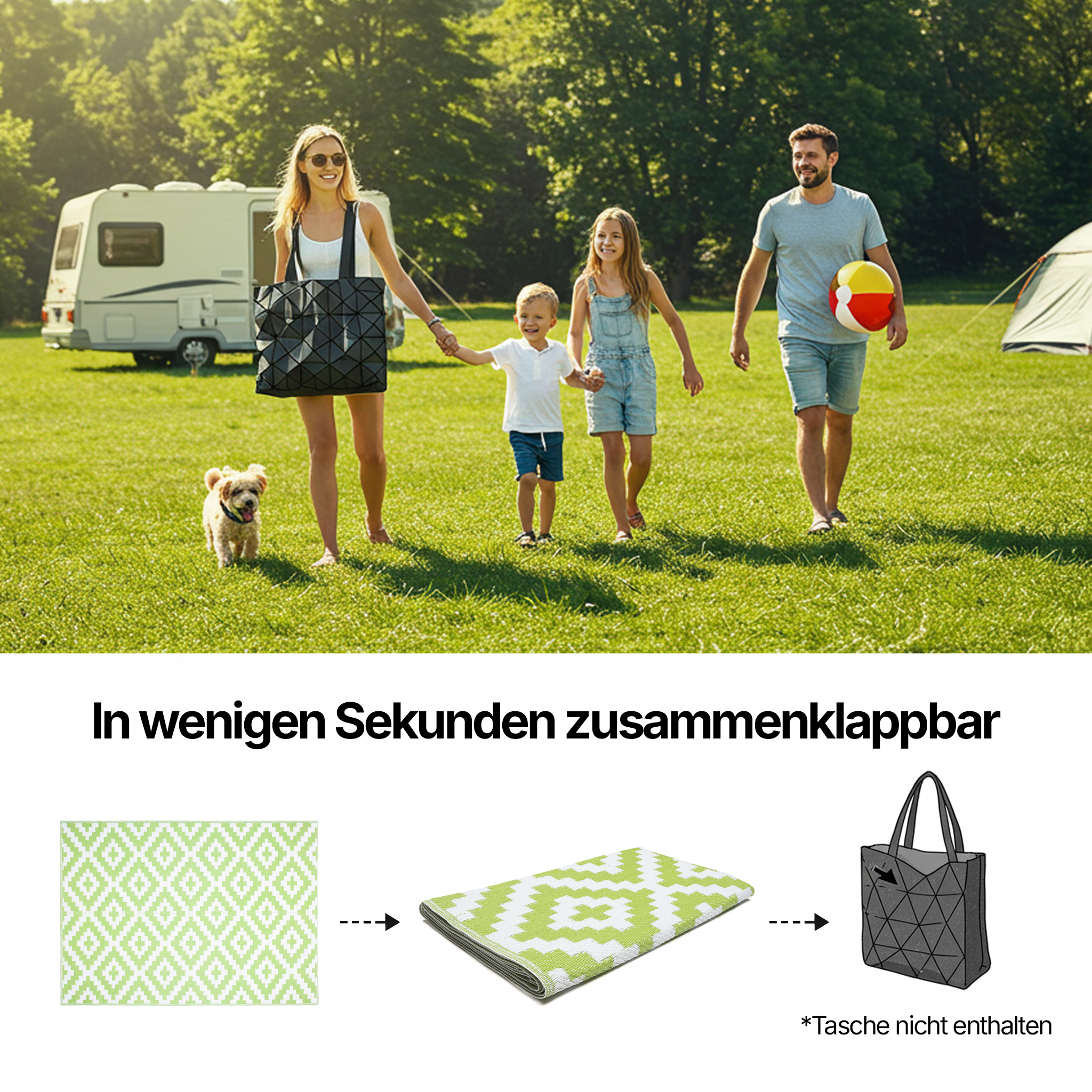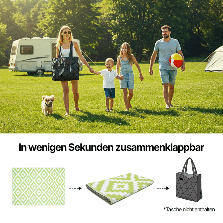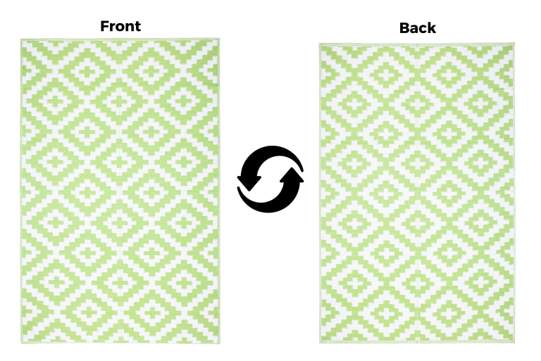 – ein Teppich aus strapazierfähigem, recycelbarem Material – OEKO-TEX-zertifiziert, enthält keine Schadstoffe – sehr langlebig und pflegeleicht – wasserfest und witterungsbeständig, verblasst nicht – faltbar – leicht zu verstauen – zweiseitig – Perfekt für: Terrasse, Patio, Balkon, Picknick, Strand, Camping