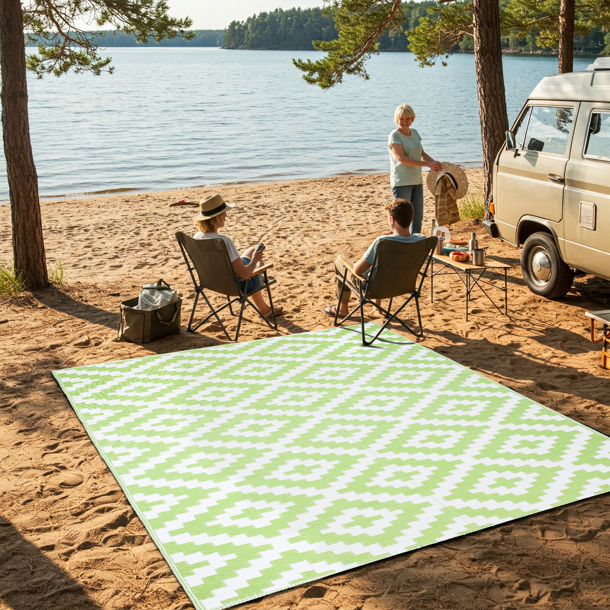 Er bietet nicht nur Komfort bei Outdoor-Aktivitäten, der Ibiza-Teppich verleiht Ihrer Umgebung auch Stil und Eleganz. Seine harmonische Kombination aus grünen und weißen Farben verleiht ihm Frische und subtilen Charme.