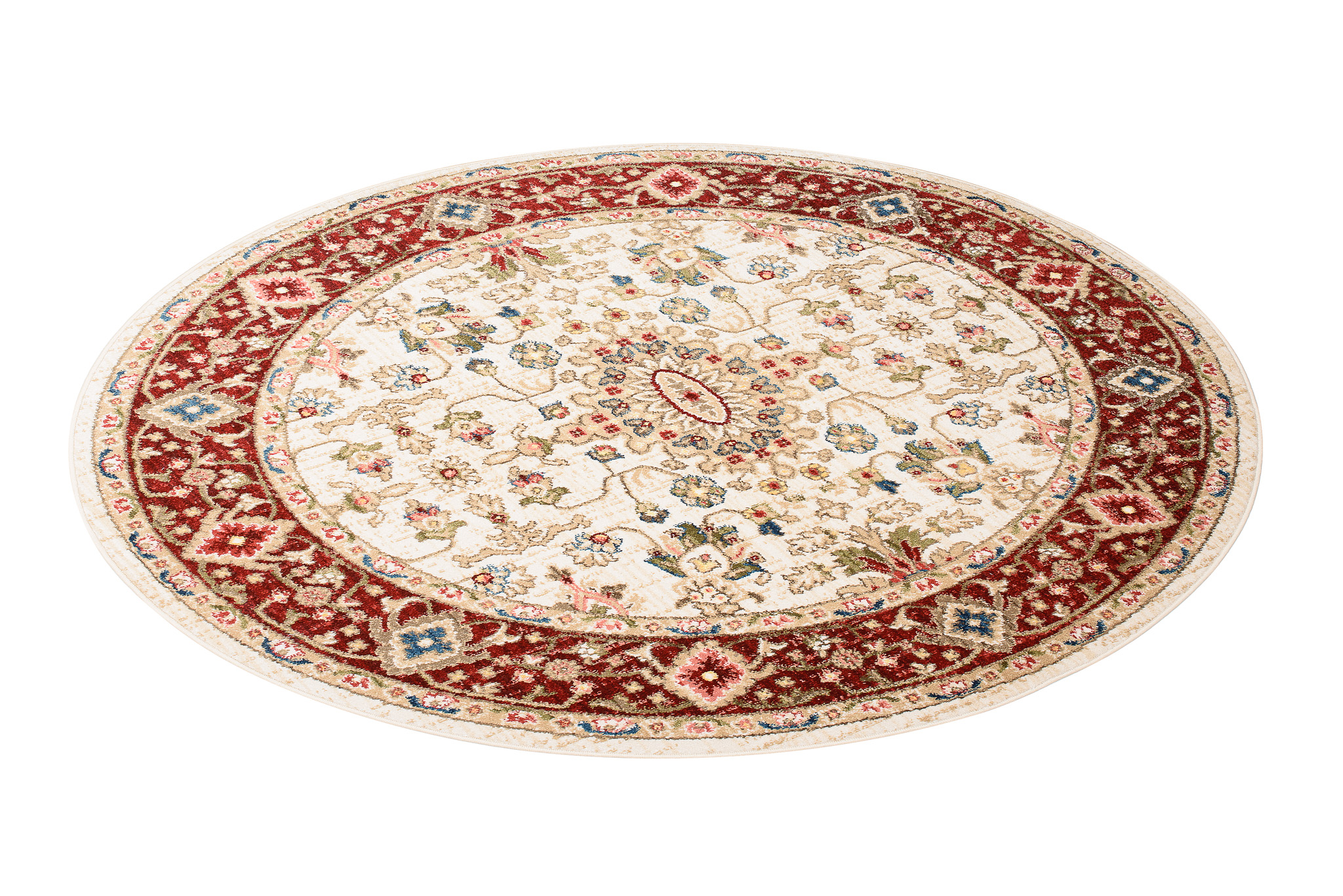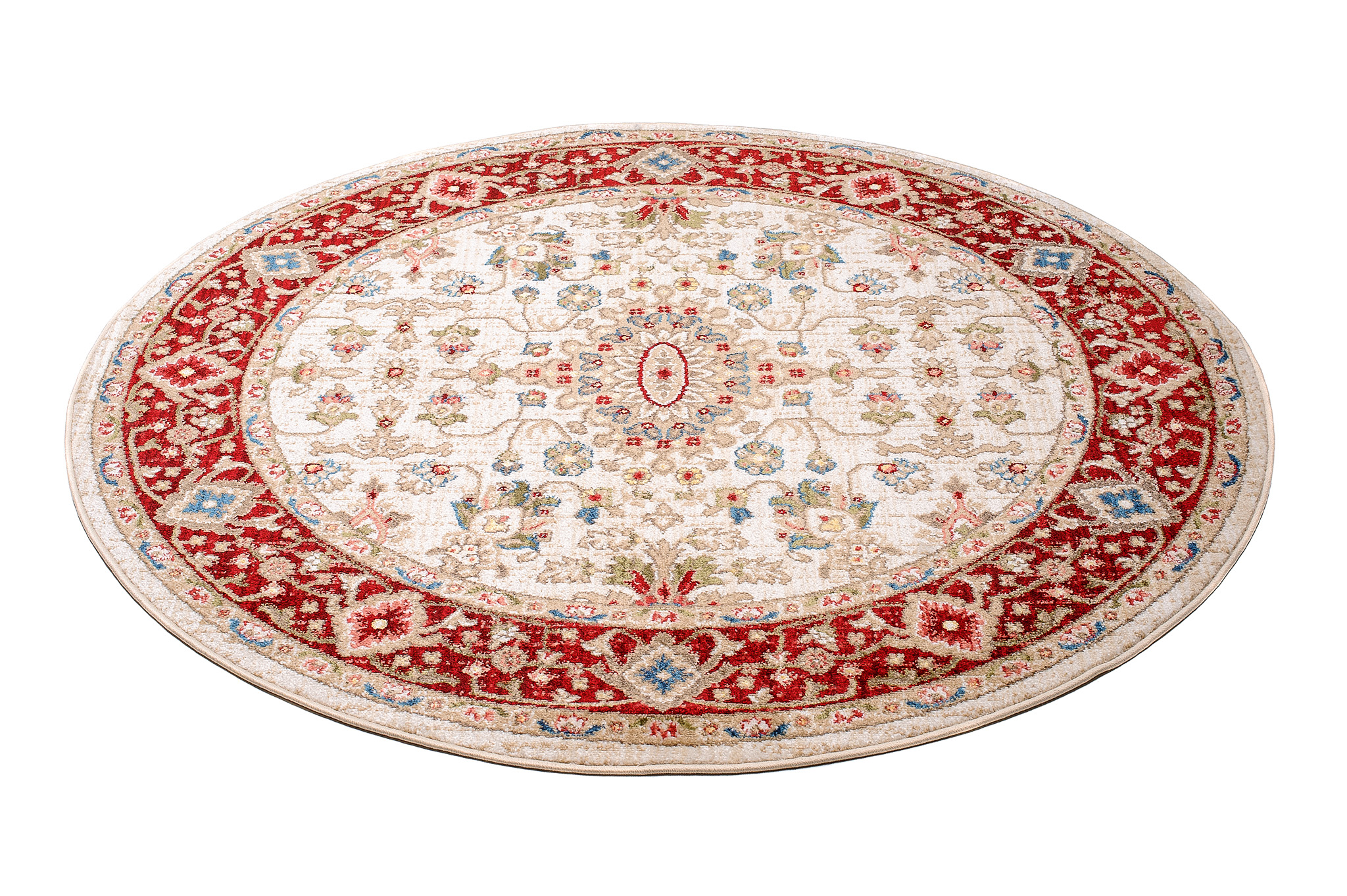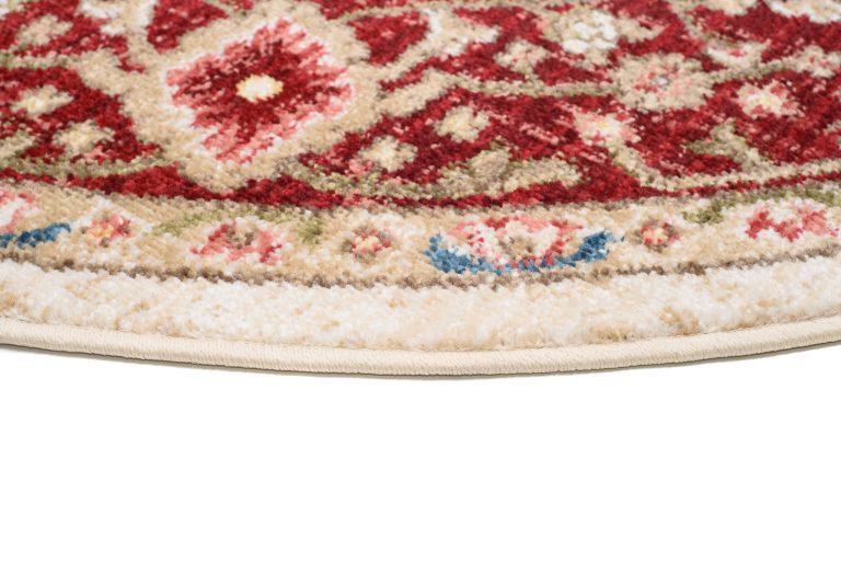 Rivoli-Teppiche sind eine Kollektion traditioneller runder Teppiche, die jedem Raum einen Hauch von Eleganz und Wärme verleihen. Mit Rot-, Blau- und Cremetönen sind diese Teppiche perfekt, um Ihrem Raum einen klassischen, raffinierten Look zu verleihen. Diese aus hochwertigen Materialien hergestellten Teppiche sind weich und strapazierfähig und eignen sich daher perfekt für stark beanspruchte Bereiche. Die traditionellen Muster, inspiriert von klassischen Motiven, verleihen Ihren Böden Tiefe und Charakter. Die Teppiche sind OEKOTEX-zertifiziert, sicher für Mensch und Tier und lösen keine Allergien aus. Der kurze Flor des Teppichs lässt sich sehr einfach absaugen, auch mit Hilfe von Saugrobotern.
